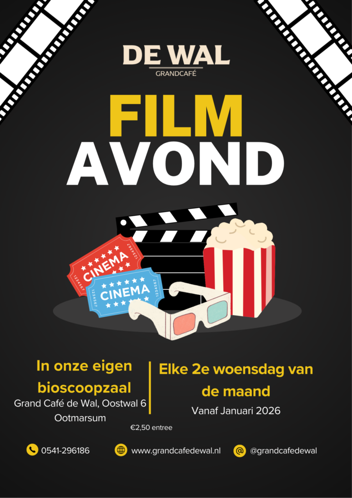 Iedere 2e woensdag van de maand organiseren wij een filmavond bij de Wal. In ons eigen bioscoop zaaltje kunt u genieten van een film die door ons team word uitgezocht.